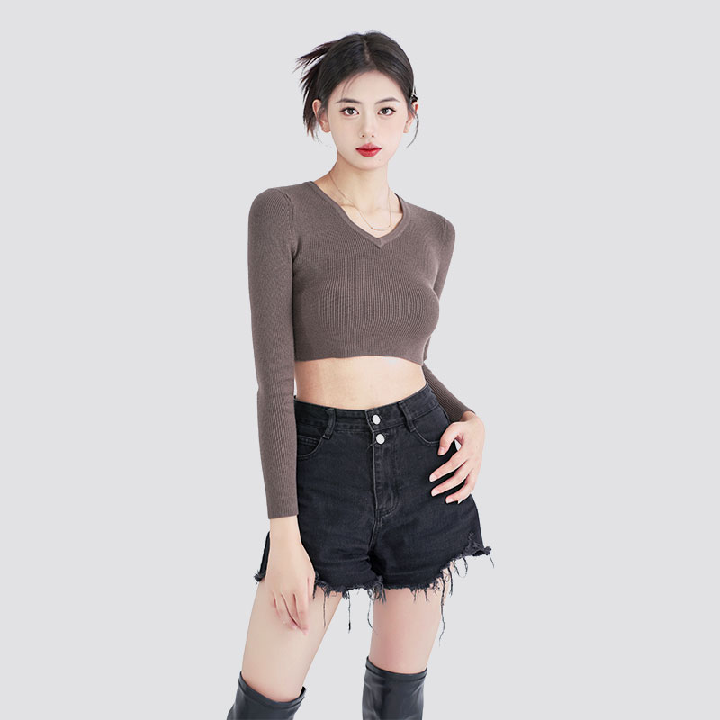 L'azienda produce principalmente maglioni lavorati a maglia per bambini, uomini e donne. Maglione pullover marrone con scollo a V aderente a maniche lunghe da donna company in China.